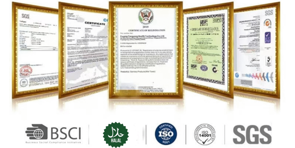 منتجاتنا آمنة بنسبة 100%، تم تصنيعها في مصنع معتمد وخضعت لاختبارات دقيقة في مختبر موثوق، كما أننا حاصلون على 5 شهادات جودة معترف بها دوليًا